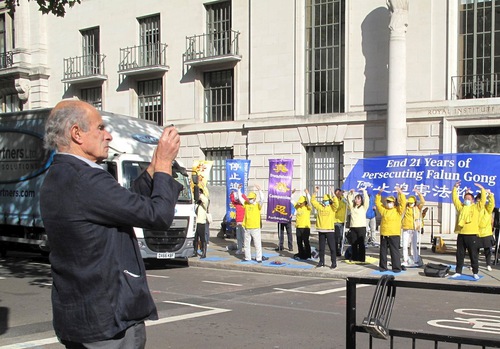 “Look at their peace and stillness,” said Anthony Silverstone, a doctor, as he passed the Chinese embassy on his way to work. He took photos with his phone and said Falun Dafa brings positive energy to the world.