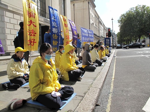 Falun Dafa practitioners at the Chinese Embassy in London protest the persecution.