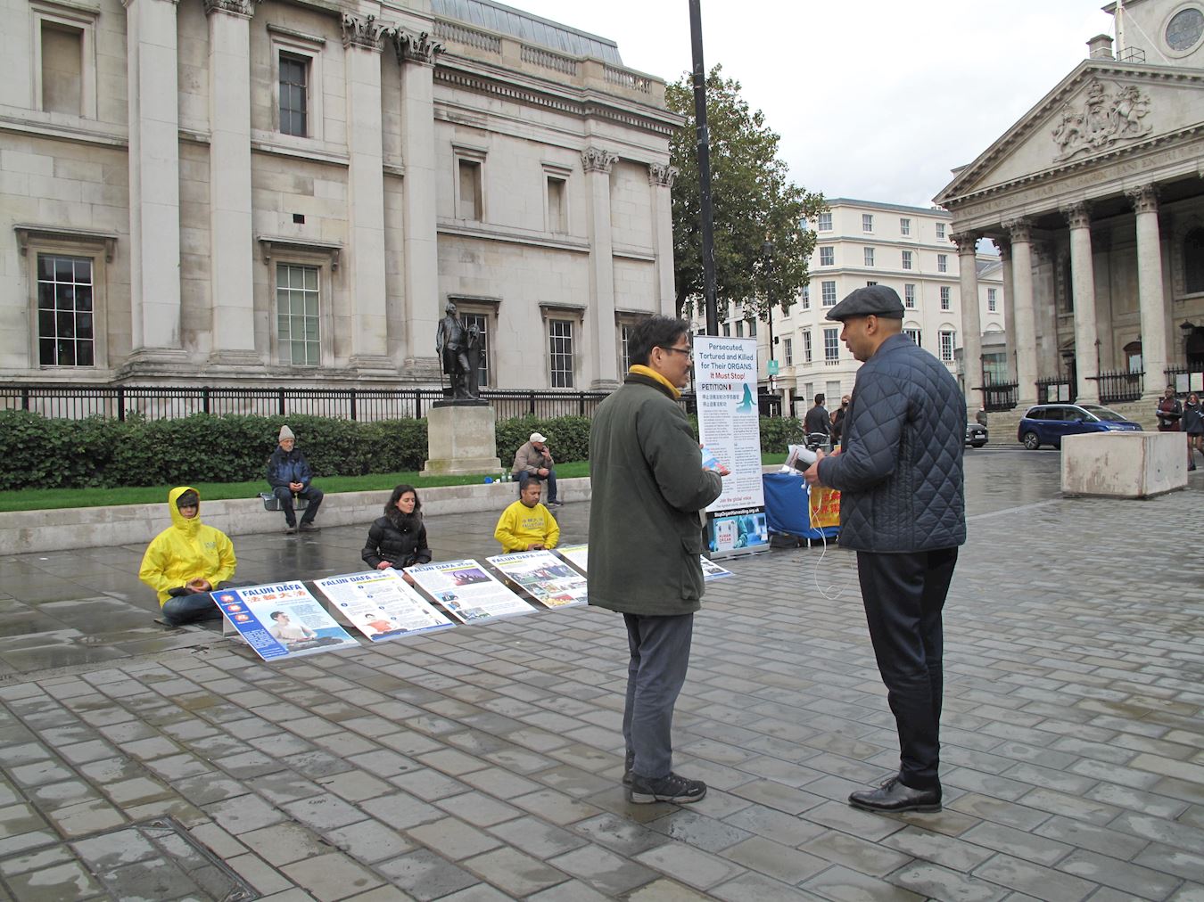(Minghui.org) Falun Gong practitioners went to Trafalgar Square and Chinatown in London on October 10, 2020, to tell people about Falun Gong and raise awareness of the ongoing persecution in China. Many passersby stopped at the booth to ask questions and sign a petition to support the practitioners' efforts.