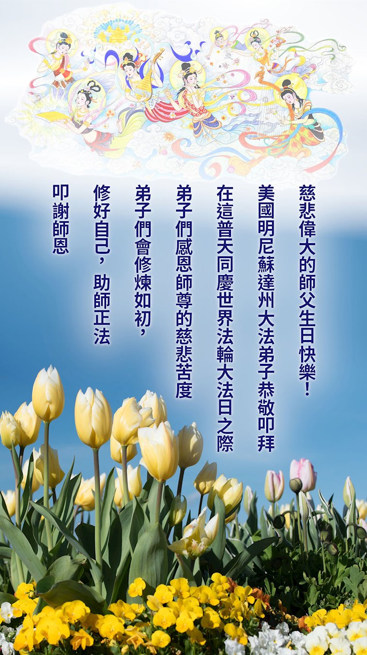 Practitioners from New Century Films, Miami, Florida, the Global Telephone-Calling Group, Minnesota, South Carolina, Massachusetts, NTD, and other places in the United States have sent their greetings and homemade greeting cards to Minghui website to celebrate this grand occasion. They express their profound gratitude to Master Li and vow to be more diligent in cultivation and help more people learn the benefits and wonderfulness of Falun Dafa.