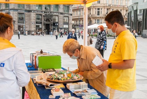(Minghui.org) Falun Dafa practitioners in Austria held two events in Vienna on May 13, 2020 to celebrate the 21st World Falun Dafa Day. They gathered on Vienna Steve Square and talked with passers-by about Falun Dafa (also known as Falun Gong) and the CCP's (Chinese Communist Party) brutal persecution in China.