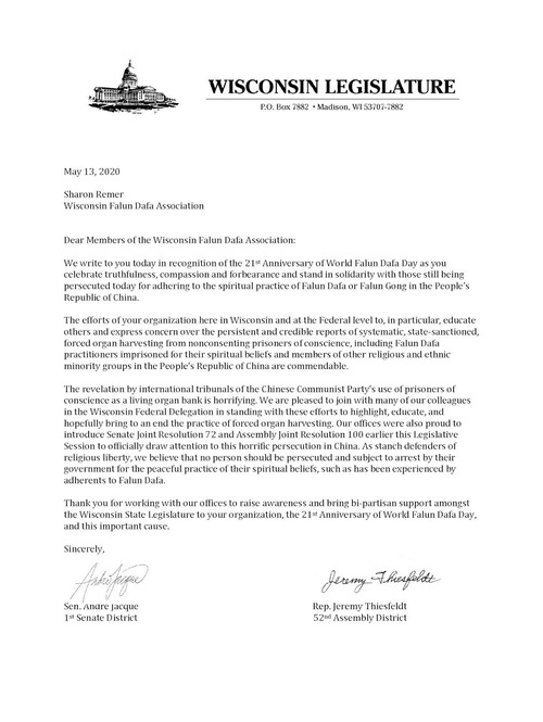 (Minghui.org) Wisconsin Senator André Jacque and Assembly Representative Jeremy Thiesfeldt sent a letter to the Wisconsin Falun Dafa Association on May 13.