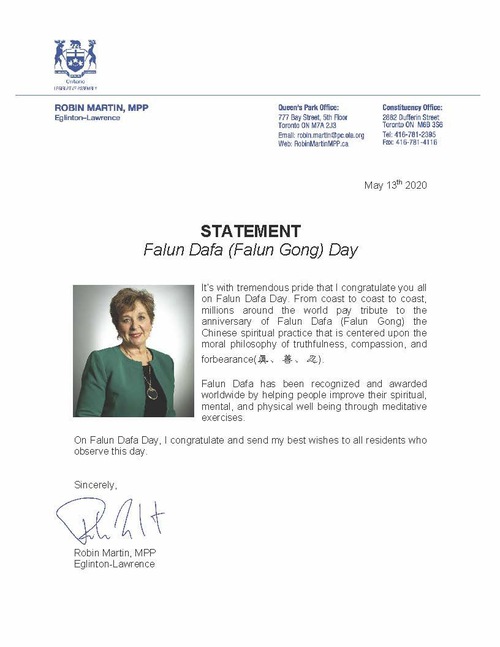 “It’s with tremendous pride that I congratulate you all on Falun Dafa Day,” wrote MPP Robin Martin. “From coast to coast, millions around the world pay tribute to the anniversary of Falun Dafa (Falun Gong) the Chinese spiritual practice that is centered upon the moral philosophy of truthfulness, compassion, and forbearance.