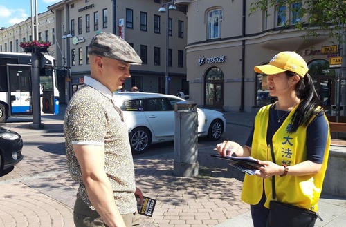 Karoliina and her boyfriend passed by and talked with a practitioner. Her boyfriend said that his friend had been to China, and had experienced the Chinese regime's information censorship. His friend also mentioned the brutal persecution of Falun Gong in China. He remarked that people there cannot talk about Falun Gong in public.