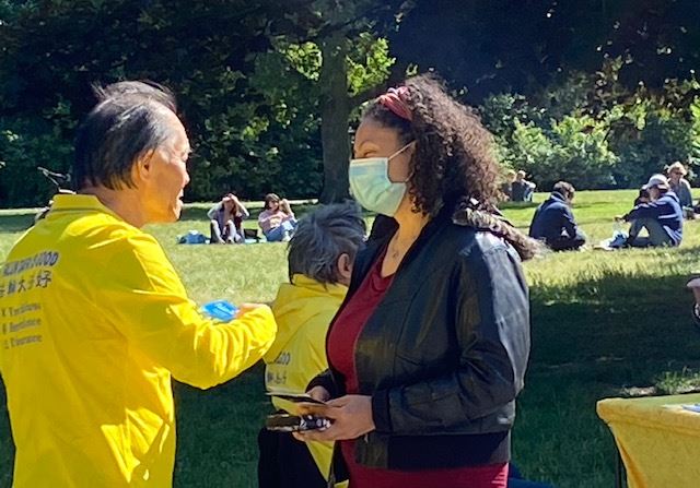 While he was riding his bike in the park on May 30, a Falun Dafa banner caught his attention. He stopped at the information table and talked with practitioners.