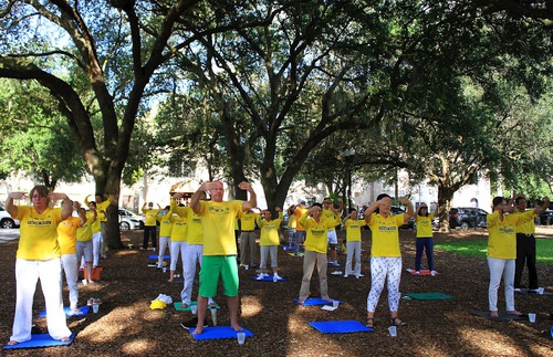 Falun Gong practitioners demonstrate the exercises at Lake Eola Park.