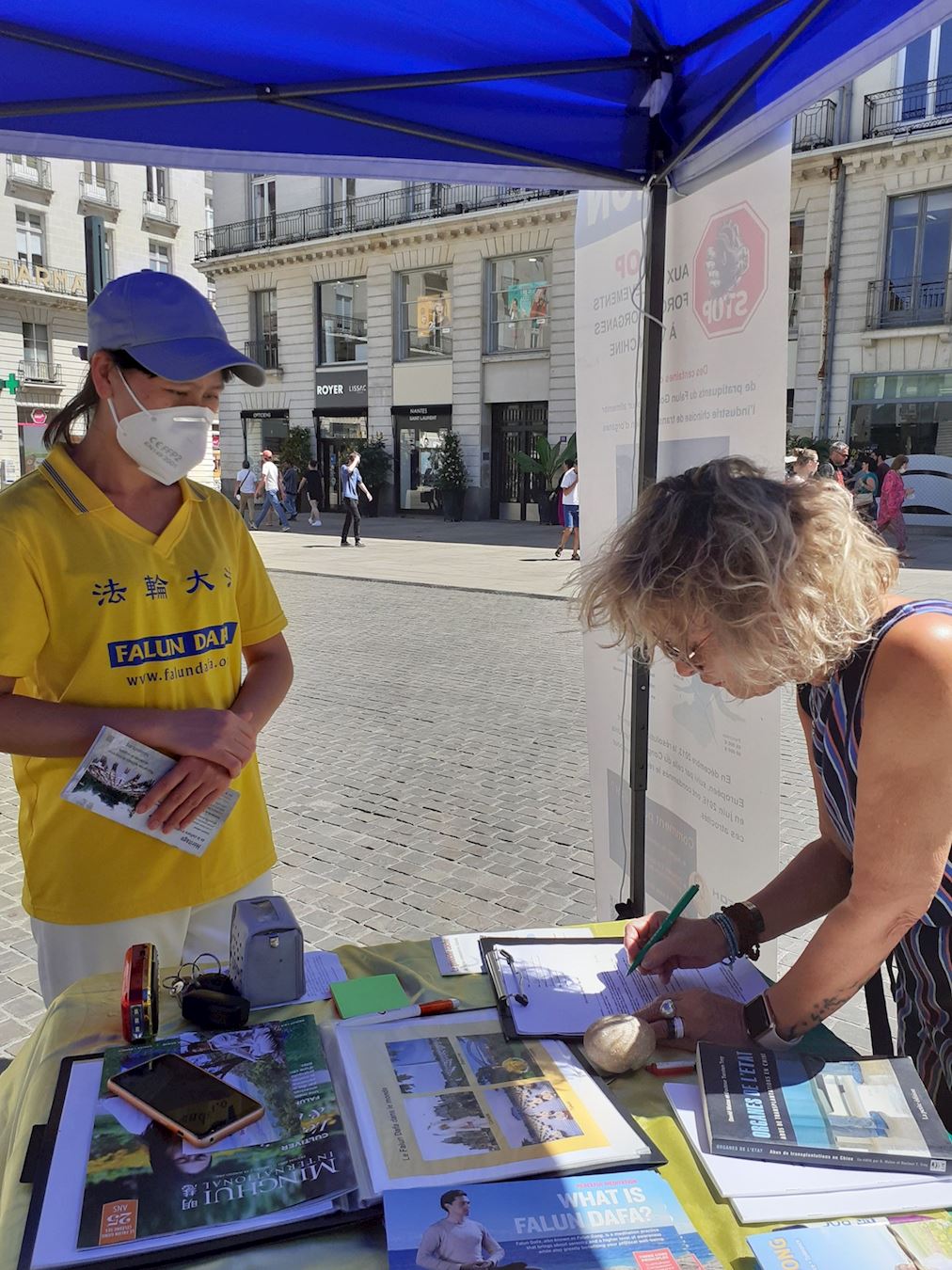 About 100 people signed the practitioners' petition during the activities on July 25. Their petition was based on the European Parliament's Written Declaration 0048/2016 (WD48), on stopping organ harvesting from prisoners of conscience in China, which was cosigned by more than half of the Parliament's members on July 12, 2016. The petition will be presented to local elected representatives in France, and practitioners will request their support to help end the persecution in China.