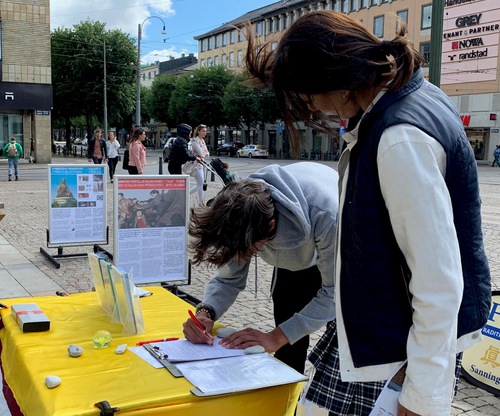 (Minghui.org) It was a brilliantly sunny day in Gothenburg, Sweden on July 12, 2020. Falun Dafa practitioners set up displays in the city center to raise awareness of the ongoing persecution of their faith in China. As practitioners demonstrated the five sets of exercises, many passersby stopped to chat and learn more about the practice.