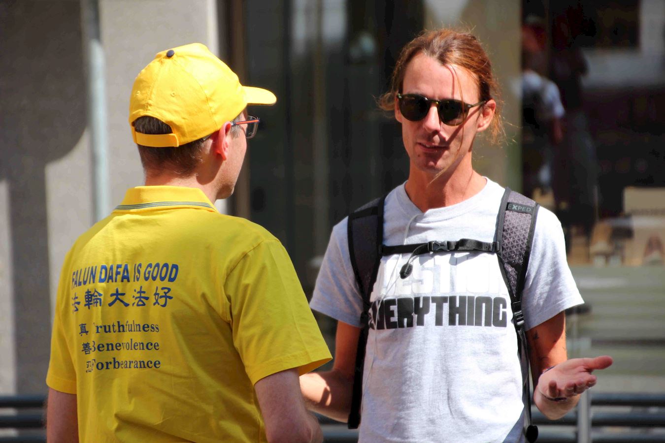 One man told practitioners that he’d learned about Falun Dafa at a similar event two years ago. “Removing people’s organs against their will should not happen. This is frightening. People’s freedom of speech is limited. The government persecutes them just because they expressed certain views. I think this is horrifying. We feel so extravagant here, to be able to enjoy such freedom, to be able to help others. It’s just a signature. It’s not too much to ask for,” he said.