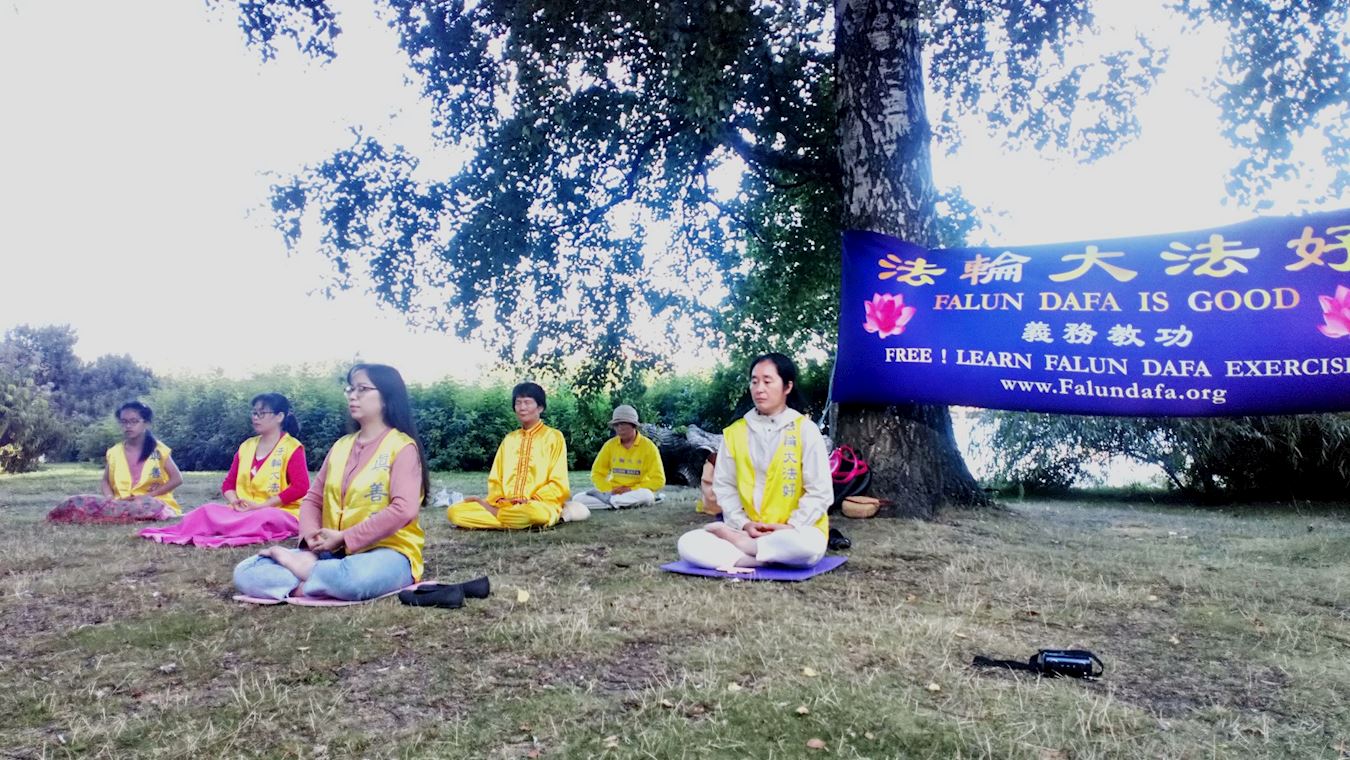 (Minghui.org) Falun Dafa practitioners in Finland did the exercises together in Hesperian puisto (Hesperia Park) in Helsinki on August 20, 2020. Near the park is a lake and the famous Finnish National Theater. The calm music and the gentle movements drew much attention from passersby.