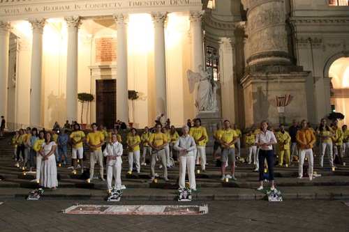Practitioners held a candlelight vigil outside the Karlskirche church in Vienna to expose the atrocities and commemorate those have been killed during the persecution in China.