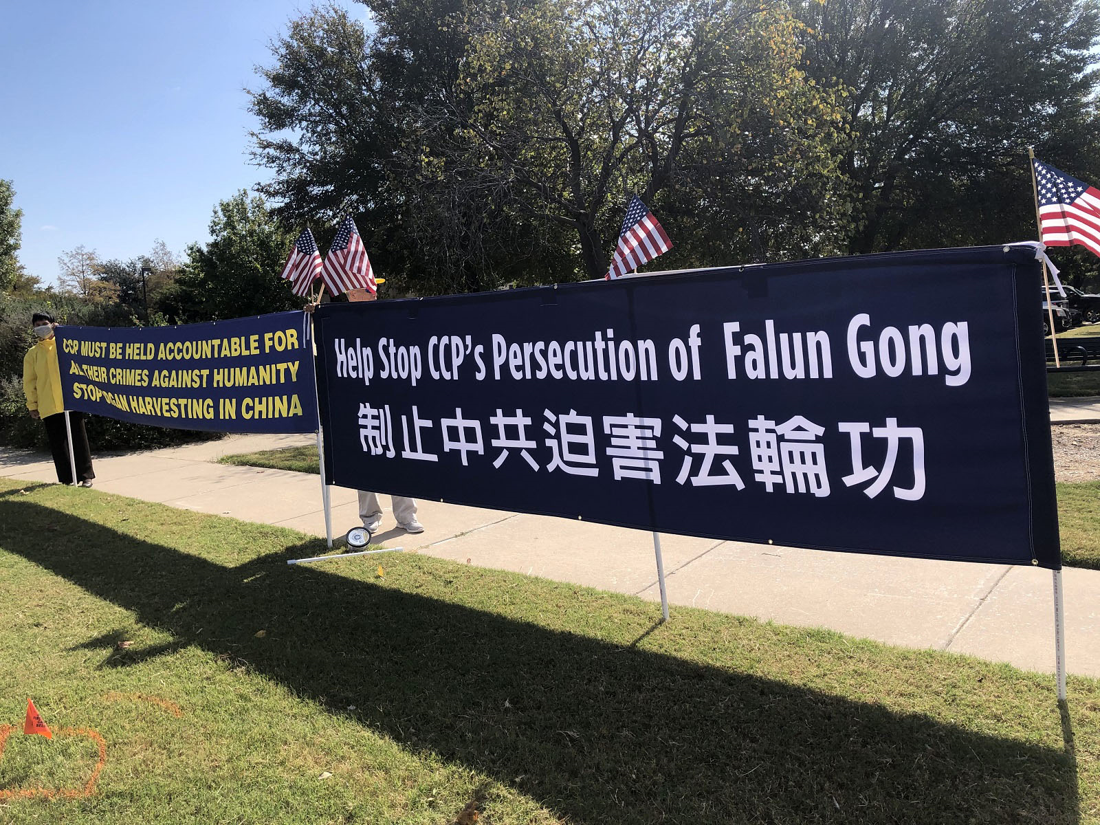 (Minghui.org) Falun Gong practitioners in Dallas, Texas have been exposing the Chinese Communist Party (CCP)’s crimes by holding large banners at busy street intersections since September 2020. Many local residents were touched by their messages and expressed their admiration for practitioners' efforts. Some even offered to help hold the banners.