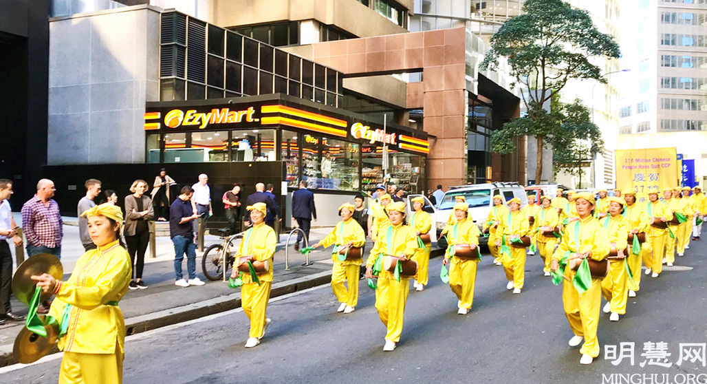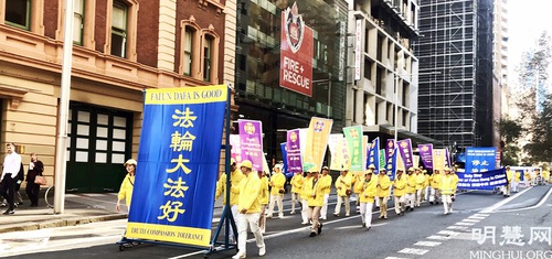 After the rally, the Tian Guo Marching Band led the procession of the Falun Dafa Day parade, which also featured the spirited performances of a colorful flag team and waist drum team.