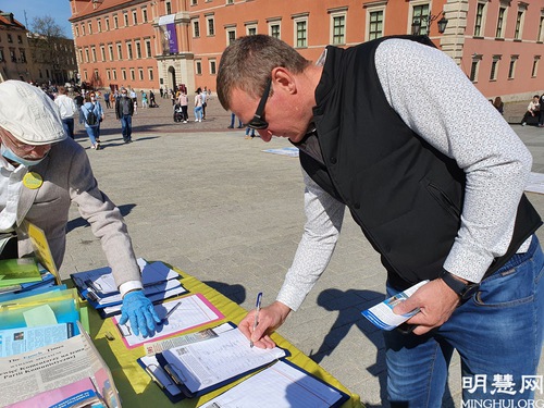 They began the day by sitting quietly in front of the Chinese Embassy in Warsaw to protest the 22-year-long Chinese Communist Party's (CCP) persecution of Falun Dafa. Passersby read their display boards and chatted with practitioners to learn more about Falun Dafa and the persecution. Many of them gave practitioners a thumbs up and signed the petition calling for an end to the persecution.