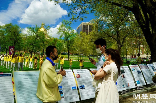(Minghui.org) Falun Dafa practitioners from the New England area gathered on the Boston Common on May 9, 2021, to celebrate the 22nd World Falun Dafa Day and the founder of Falun Dafa Master Li Hongzhi’s 70th Birthday.
