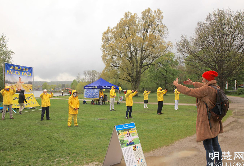 (Minghui.org) On May 13, 2021, World Falun Dafa Day, practitioners from Munich celebrated at the Starnberger See. Hansjörg Müller, a member of the Bavarian German Bundestag, gave a speech at the event. The Falun Dafa waist drum team also performed during the activities.