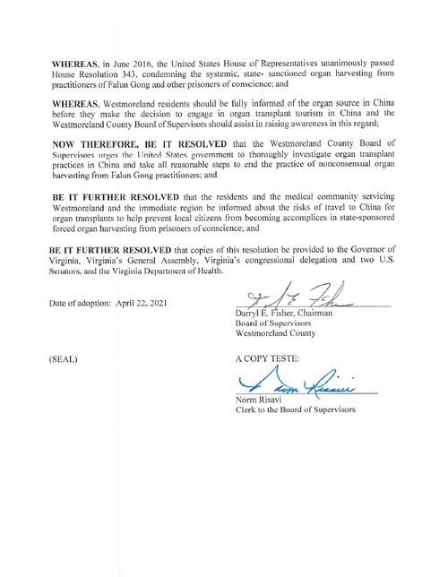 Now therefore, be it resolved that the Westmoreland County Board of Supervisors urges the United States government to thoroughly investigate organ transplant practices in China and take full reasonable steps to end the practice of nonconsensual organ harvesting from Falun Gong practitioners; and