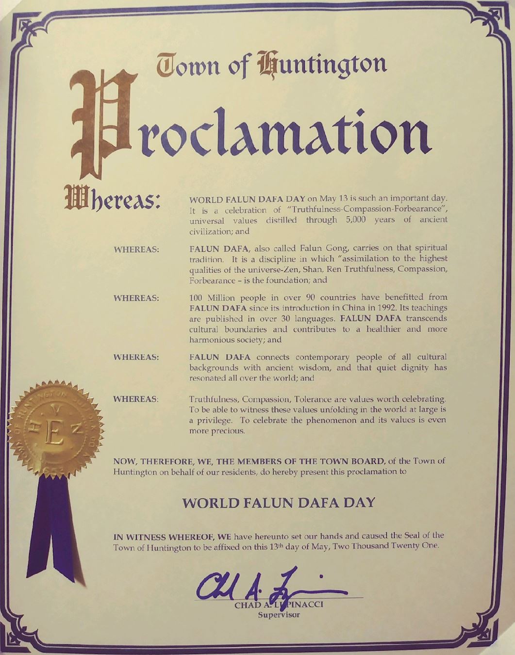 Proclamation from Supervisor Chad A. Lupinacci of the Town of Humtington
