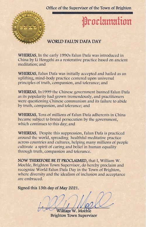 (Minghui.org) May 13, 2021, was the 22nd World Falun Dafa Day and the 29th anniversary of Falun Dafa’s public introduction. Elected officials in ten cities and towns in New York issued proclamations, citations, and certificates to mark the occasion. They commended Falun Dafa and the universal values of Truthfulness-Compassion-Forbearance that have benefited over 100 million people with improved health.
