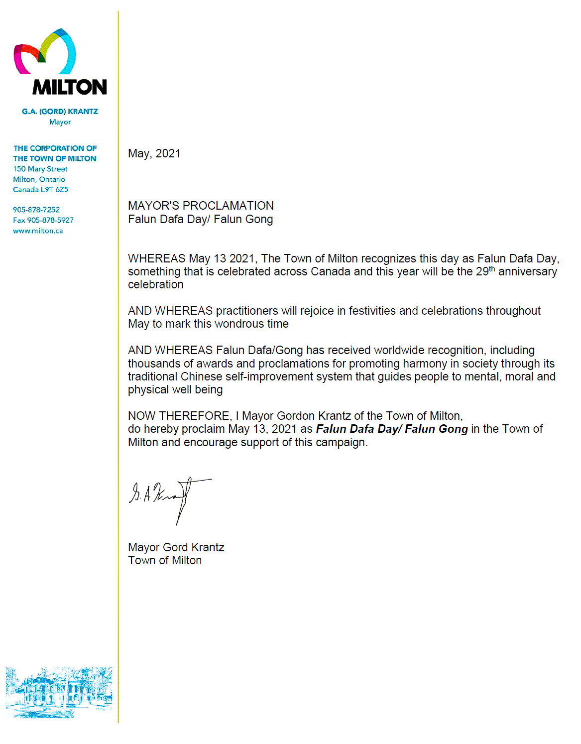 Mayor Gordon Krantz proclaimed “May 13, 2021 as Falun Dafa Day/ Falun Gong in the Town of Milton and encourage support of this campaign.”