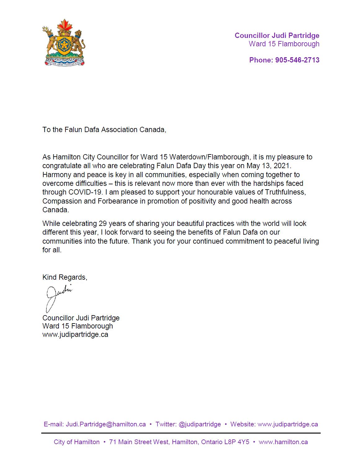 City Councilor Judi Partridge of Hamilton sent a greeting letter, “I am pleased to support your honourable values of Truthfulness, Compassion and Forbearance in promotion of positivity and good health across Canada.