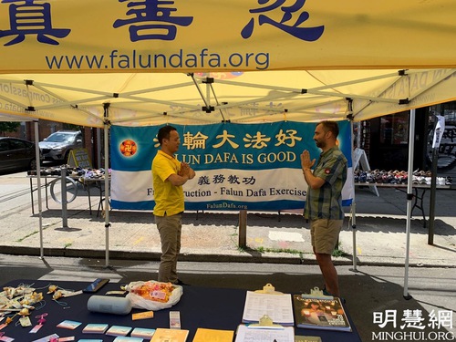 (Minghui.org) The Astoria Festival was postponed for a year and a half because of the pandemic, but it reopened to the public on Independence Day, July 4, 2021. Falun Dafa practitioners set up a booth and taught the exercises free of charge to anyone who was interested. The event attracted many people and was warmly received by the locals.