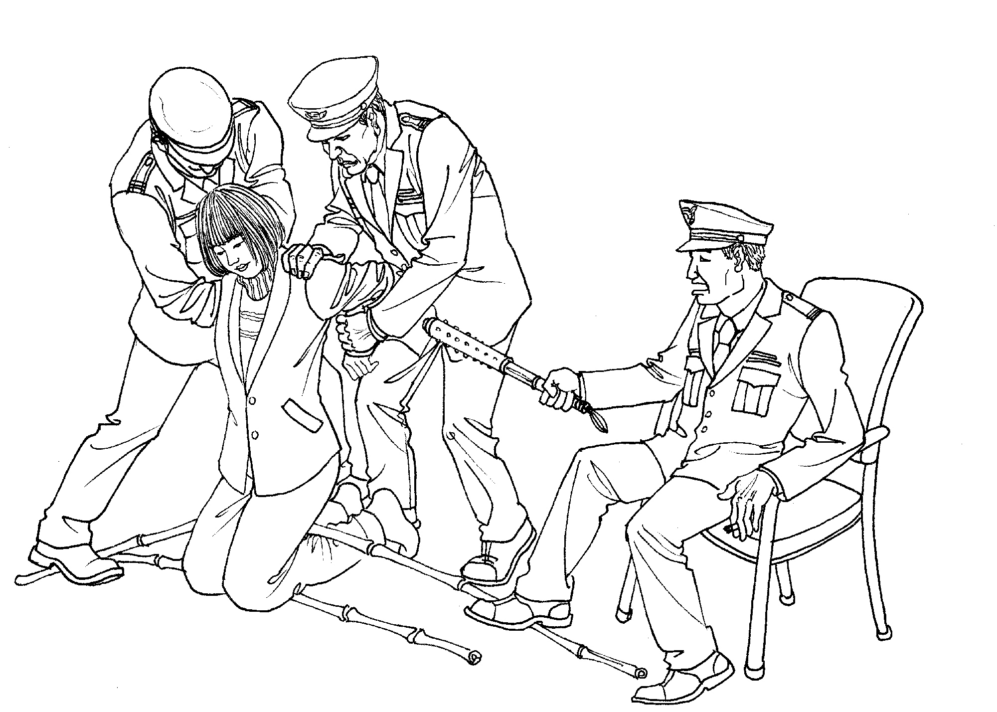 Fu Wei, Tang Jianmin, Chen Xingguo and Zeng Zhefu of the Lou District Domestic Security Office slapped her in the face and hit her on the chest and head. Several of them pushed her to sit on the ground and stepped on her feet. Then they handcuffed her behind her back and pulled her arms all the way up. To keep her arms up without falling down, they found a high-back chair, inserted the back of the chair into the cavity formed by her arms, and then placed some hard objects on the chair (see illustration below). In the meantime, they continued to step on her feet, prick her waist with needles and burn her body with cigarette butts.