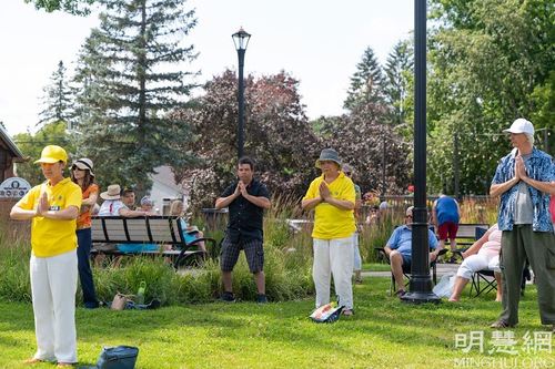 (Minghui.org) Falun Dafa practitioners held activities at Saint-Sauveur, Quebec on July 24, 2021 to call attention to the CCP’s (Chinese Communist Party) 22 year long persecution of the spiritual practice. They demonstrated the exercises, distributed information about the CCP’s crimes of forced live organ harvesting which targets Falun Dafa practitioners, and the Tian Guo Marching Band performed. Many people were out enjoying the warm, sunny weather on Saturday. They were attracted by the music and many signed the petition to condemn the persecution.