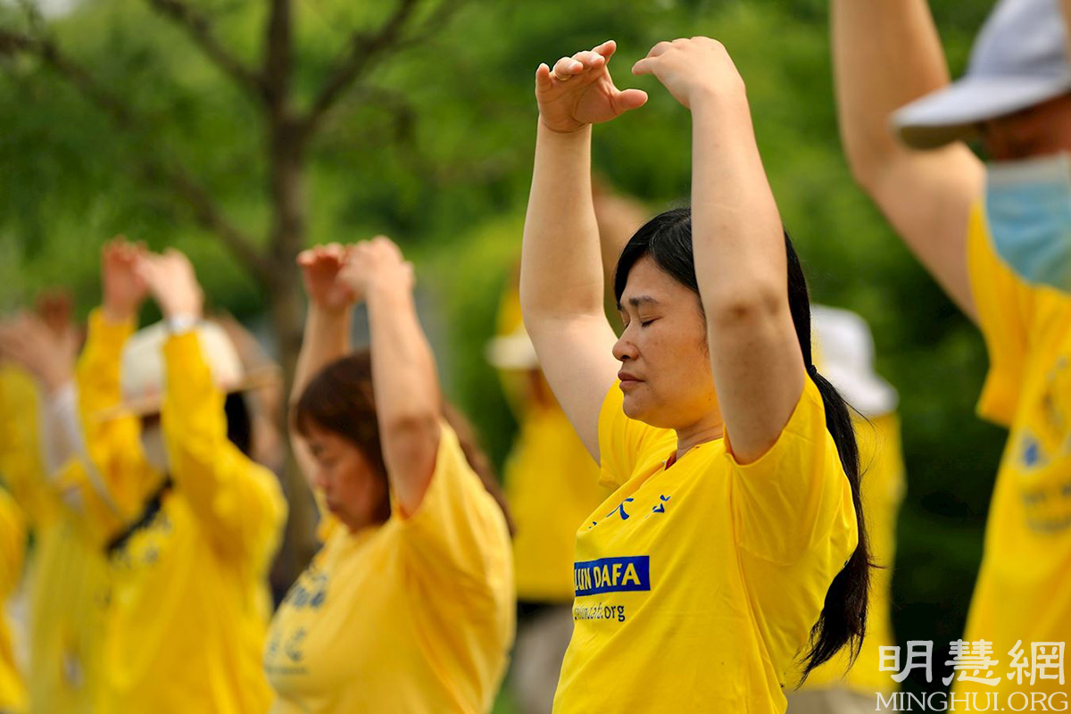 Ms. Li Eying doing the Falun Gong exercise during a rally commemorating the 22nd anniversary of the persecution of Falun Gong in front of the Chinese Embassy in Canada