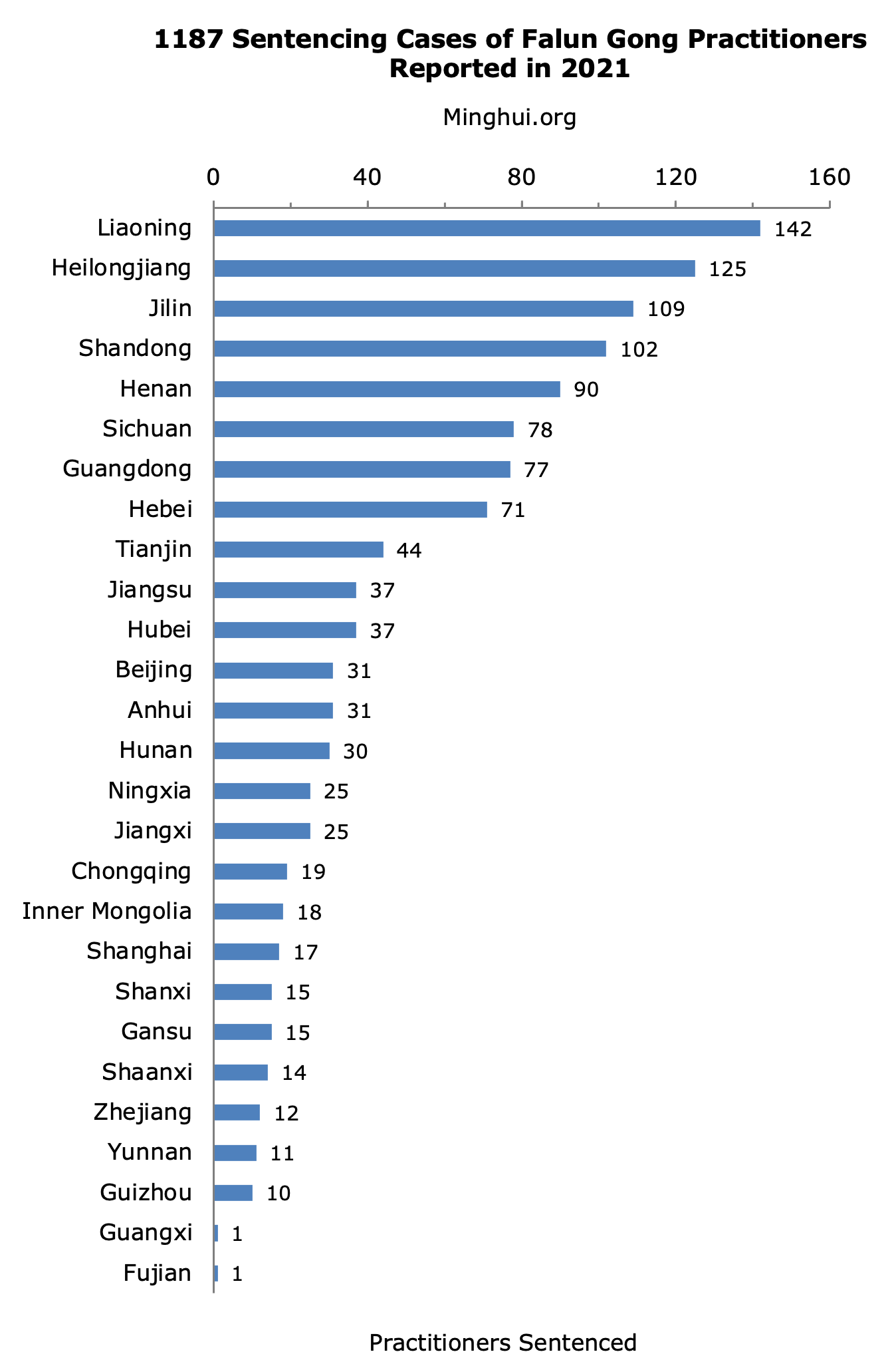 (Minghui.org) The year 2021 recorded a total of 1,187 Falun Gong practitioners sentenced to prison for their faith, a mind-body practice also known as Falun Dafa that has been persecuted by the Chinese communist regime since 1999.
