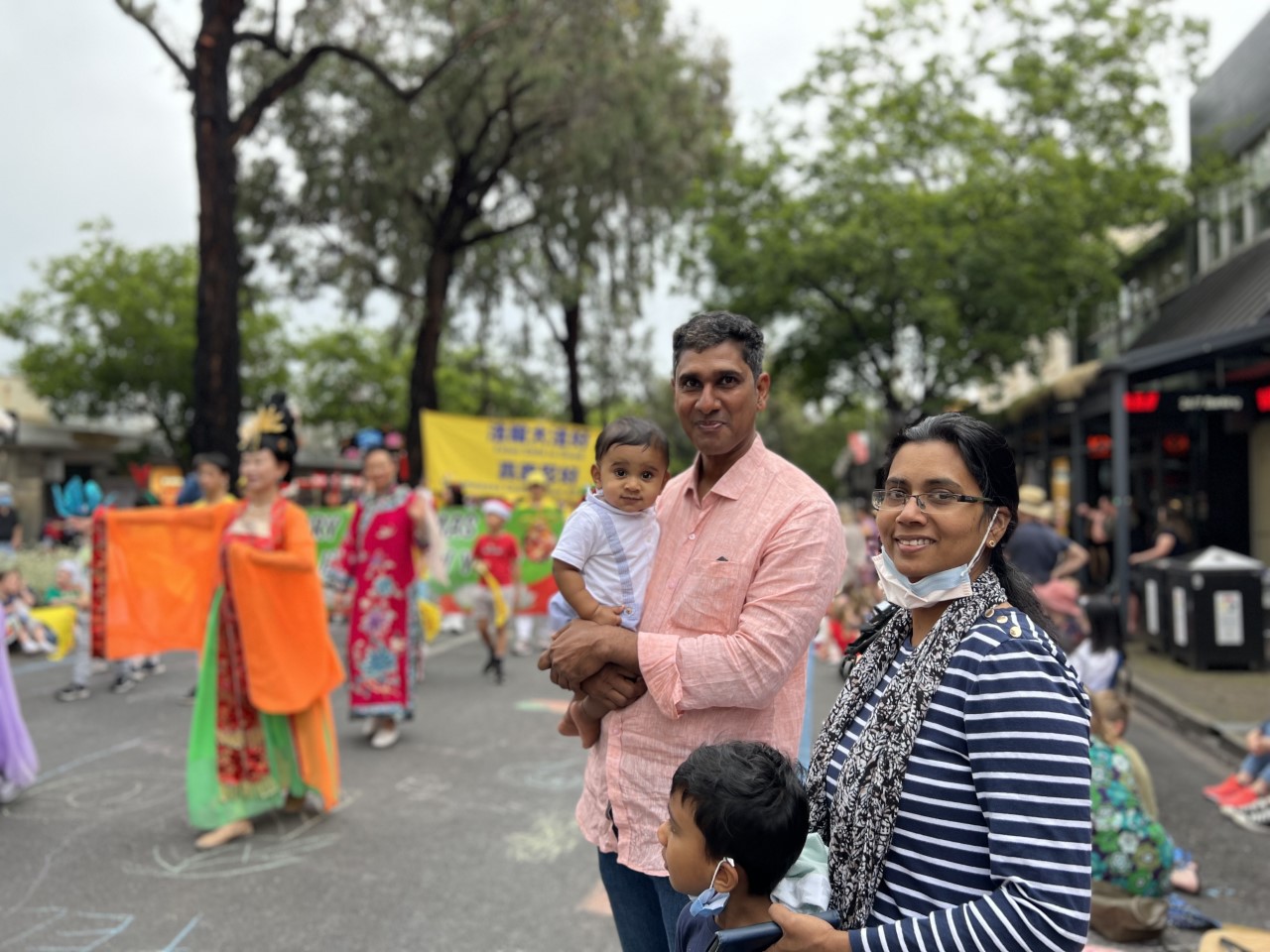 Justin, who works in the health department, brought his family to the parade. He was happy to see practitioners and said their procession was filled with brilliant colors and looked beautiful. He wanted to learn more about Falun Dafa’s principles of Truthfulness-Compassion-Forbearance, noting, “These principles are very good.”