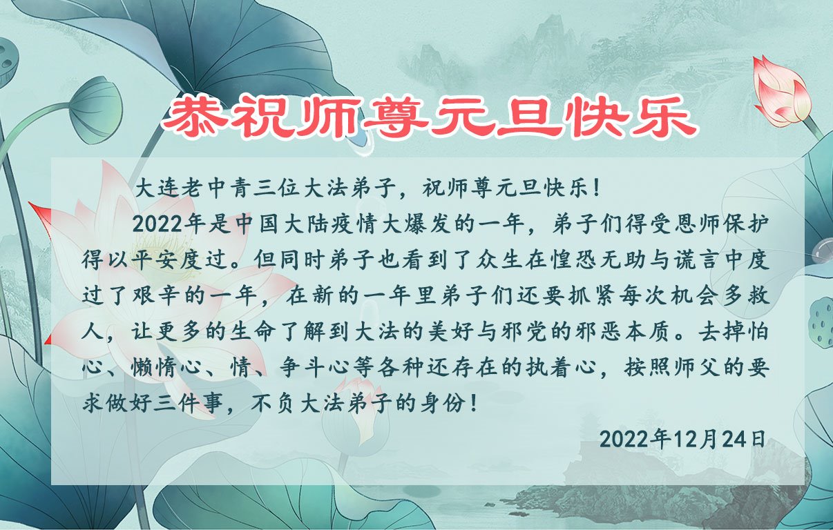 (Minghui.org) In this report, we present a selection of the 23 greetings sent from Falun Dafa practitioners in Dalian City, Liaoning Province, China: