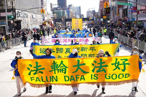(Minghui.org) Falun Dafa practitioners participated in the Chinese New Year parade in Flushing, New York, on February 5, 2022. This parade is the largest event of its kind on the U.S. east coast. Spectators expressed their admiration for the variety and meaning in the Falun Dafa contingent.