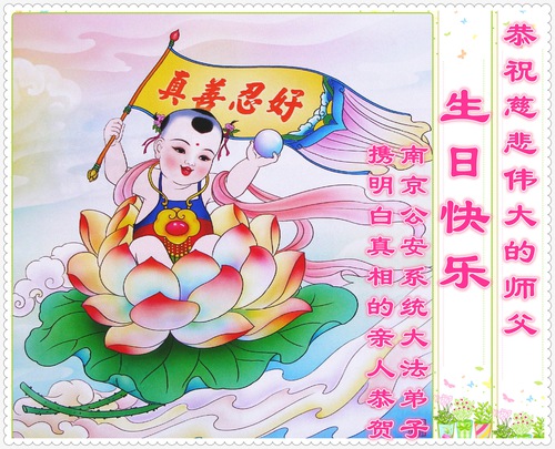 An elderly couple who retired from a government agency in Zhaoyuan City, Shandong Province, wrote, “Master, you have been working hard! In our over 20 years of practicing Dafa, you have been protecting us and guiding us all along. You gave us good health and disclosed to us the true meaning of life. Because we practice Dafa, our lives are fulfilled. Our faith in Master and Dafa will never change.”