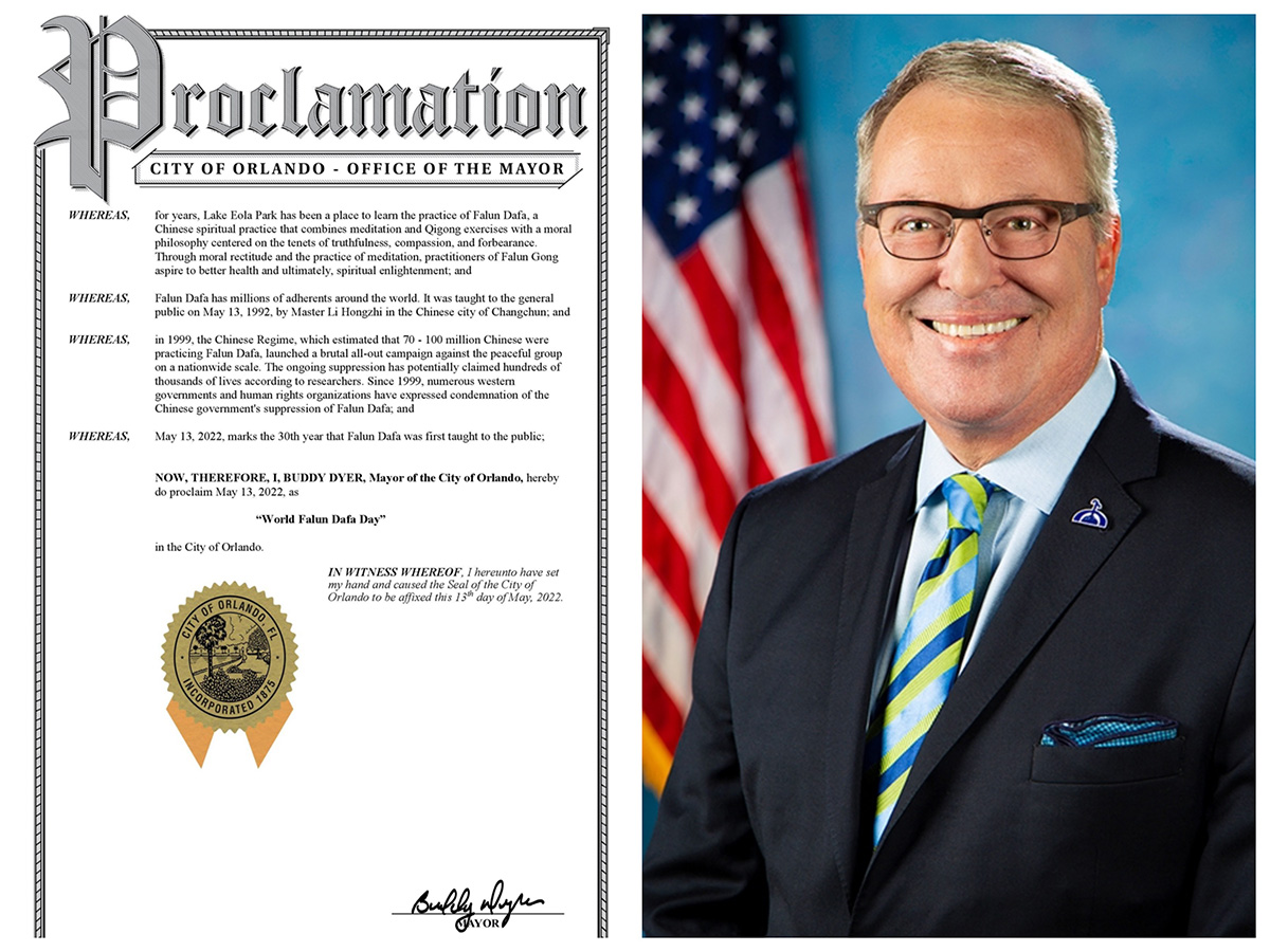The proclamation from Orlando reads, “For years, Lake Eola Park has been a place to learn the practice of Falun Dafa, a Chinese spiritual practice that combines meditation and Qigong exercises with a moral philosophy centered on the tenets of truthfulness, compassion, and forbearance. Through moral rectitude and the practice of meditation, practitioners of Falun Gong aspire to better health and ultimately, spiritual enlightenment.