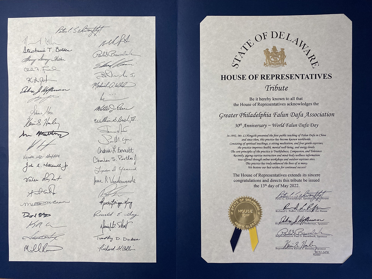 (Minghui.org) May 13, 2022, was World Falun Dafa Day and the 30th anniversary of Falun Dafa’s introduction to the world. The Delaware House of Representatives issued a tribute praising Falun Dafa for improving the lives of countless people. On the morning of May 11, at a meeting with voters held in Deer Park Tavern restaurant in Newark, Delaware, Representative Paul Baumbach personally presented the tribute to Falun Dafa practitioners and expressed his admiration to Mr. Li Hongzhi, the founder of Falun Dafa.