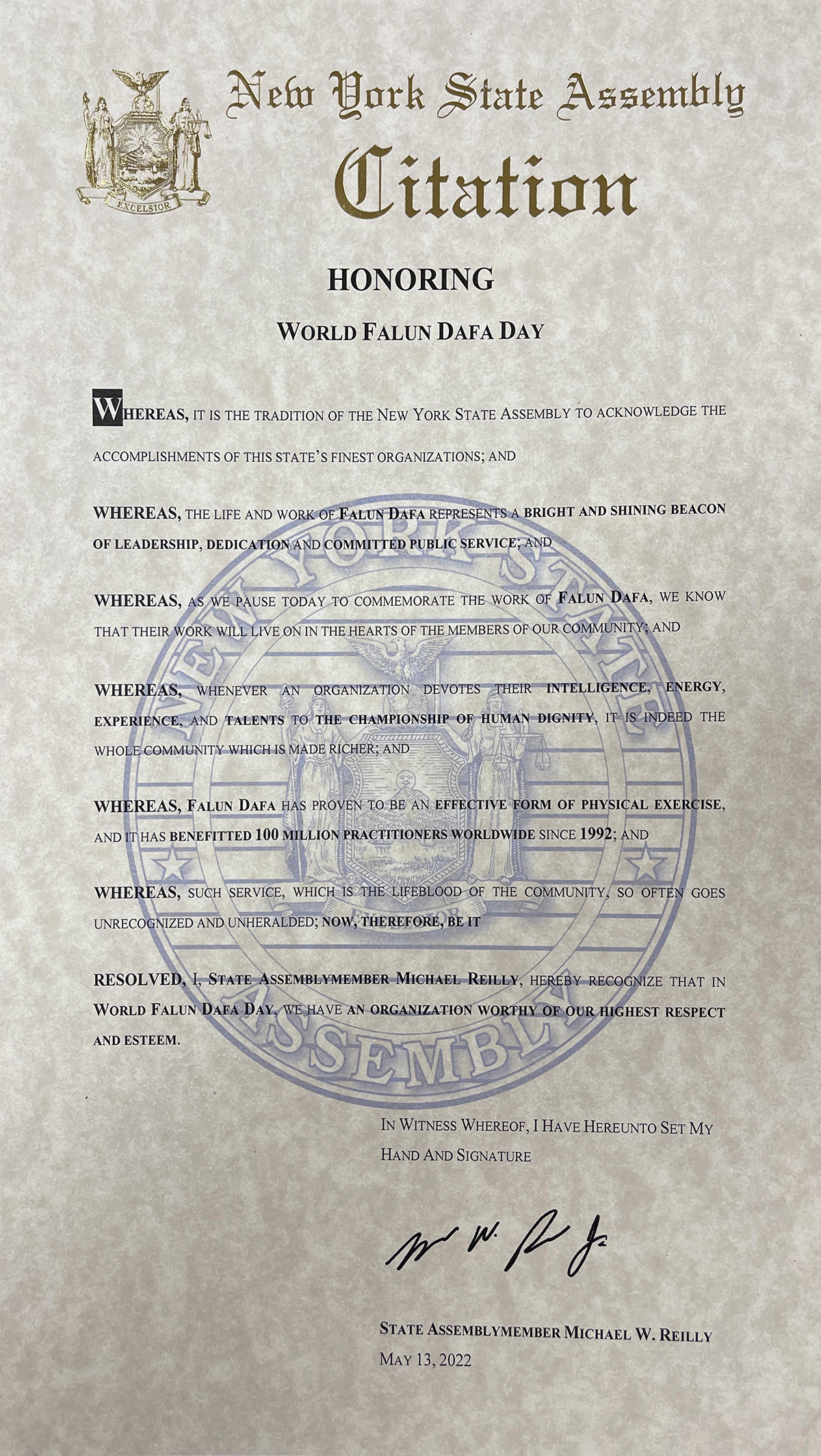 (Minghui.org) May 13 is World Falun Dafa Day, and this year is the 30th anniversary of Falun Dafa’s public introduction. Twenty-two New York State Assembly Members issued citations to recognize World Falun Dafa Day.