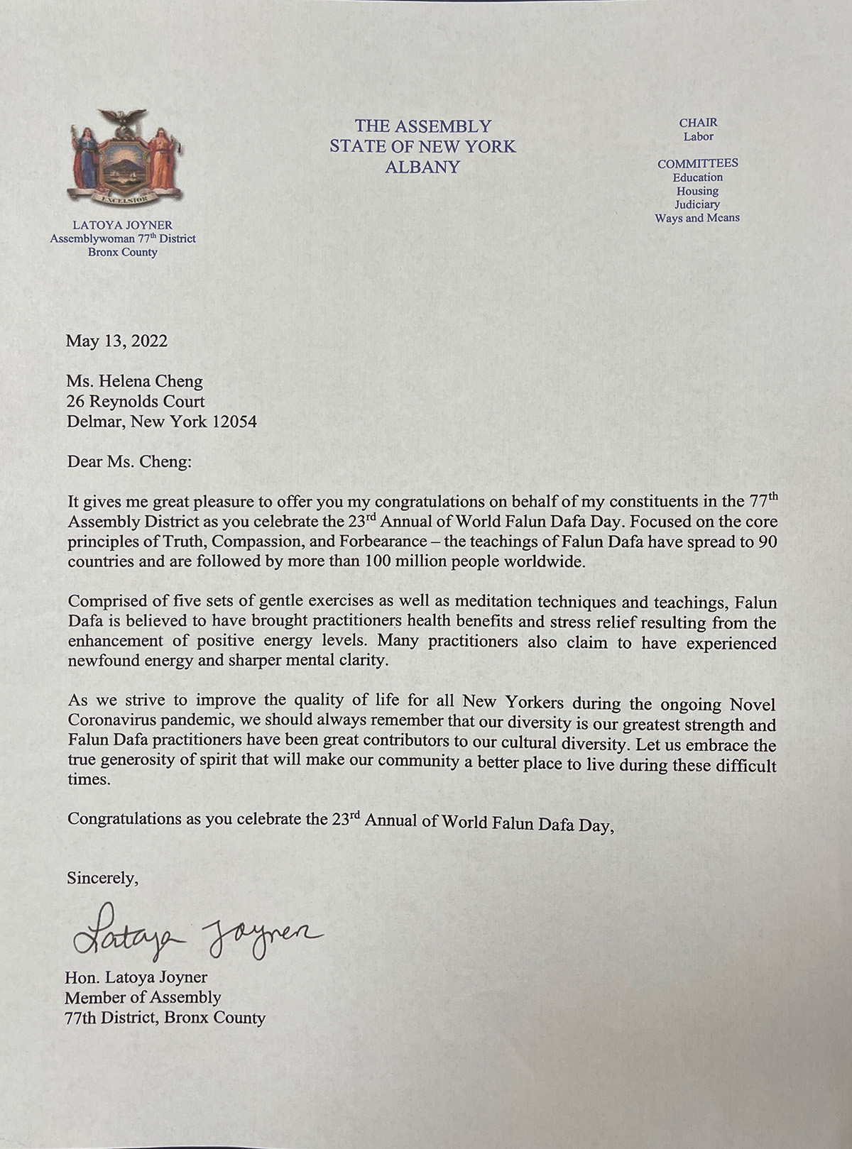 Letter from Assembly Member Latoya Joyner of the 77th District