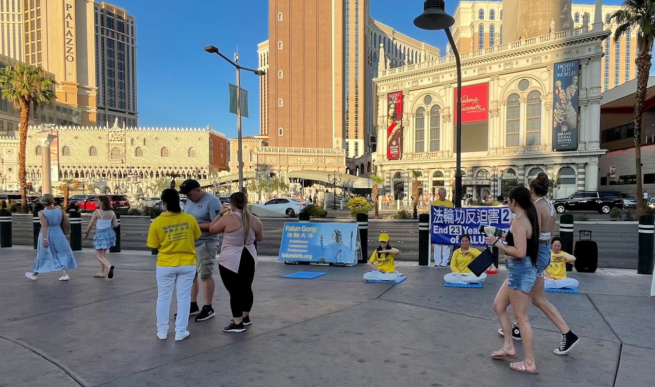 (Minghui.org) Falun Dafa practitioners in Las Vegas performed the exercises and held a rally on the city’s busiest casino boulevard on the evening of July 15, 2022. Their event was a peaceful protest against the Chinese Communist Party (CCP)’s persecution of Falun Dafa which has continued for 23 years. They called on kind people to support Falun Dafa practitioners’ efforts to end the persecution and stop the CCP’s live organ harvesting.