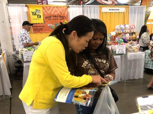 (Minghui.org) The 61st Annual Food and New Product Show was held at the Neal S. Blaisdell Exhibition Hall October 6-8, 2023. It showcased new food delicacies, innovative products, local jewelry makers and artisans, and live entertainment. At the Falun Dafa booth, practitioners demonstrated the exercises and told people about the practice and the universal principles of Truthfulness, Compassion, and Forbearance.
