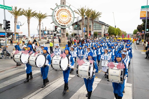 (Minghui.org) Falun Dafa practitioners were invited to participate in the 102nd Veterans Day Parade in San Francisco on November 5, 2023. Many people said the Tian Guo Marching Band’s music was beautiful and the message of Truthfulness, Compassion, and Forbearance moved some spectators to tears.