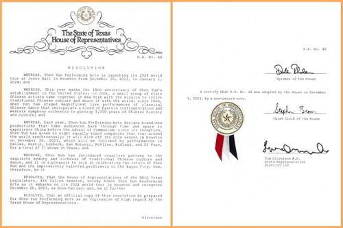 The resolution reads, “...be it RESOLVED, That the House of Representatives of the 88th Texas Legislature, 4th Called Session, hereby honor Shen Yun Performing Arts as it embarks on its 2024 world tour in Houston and recognize December 26, 2023, as Shen Yun Day; and, be it further