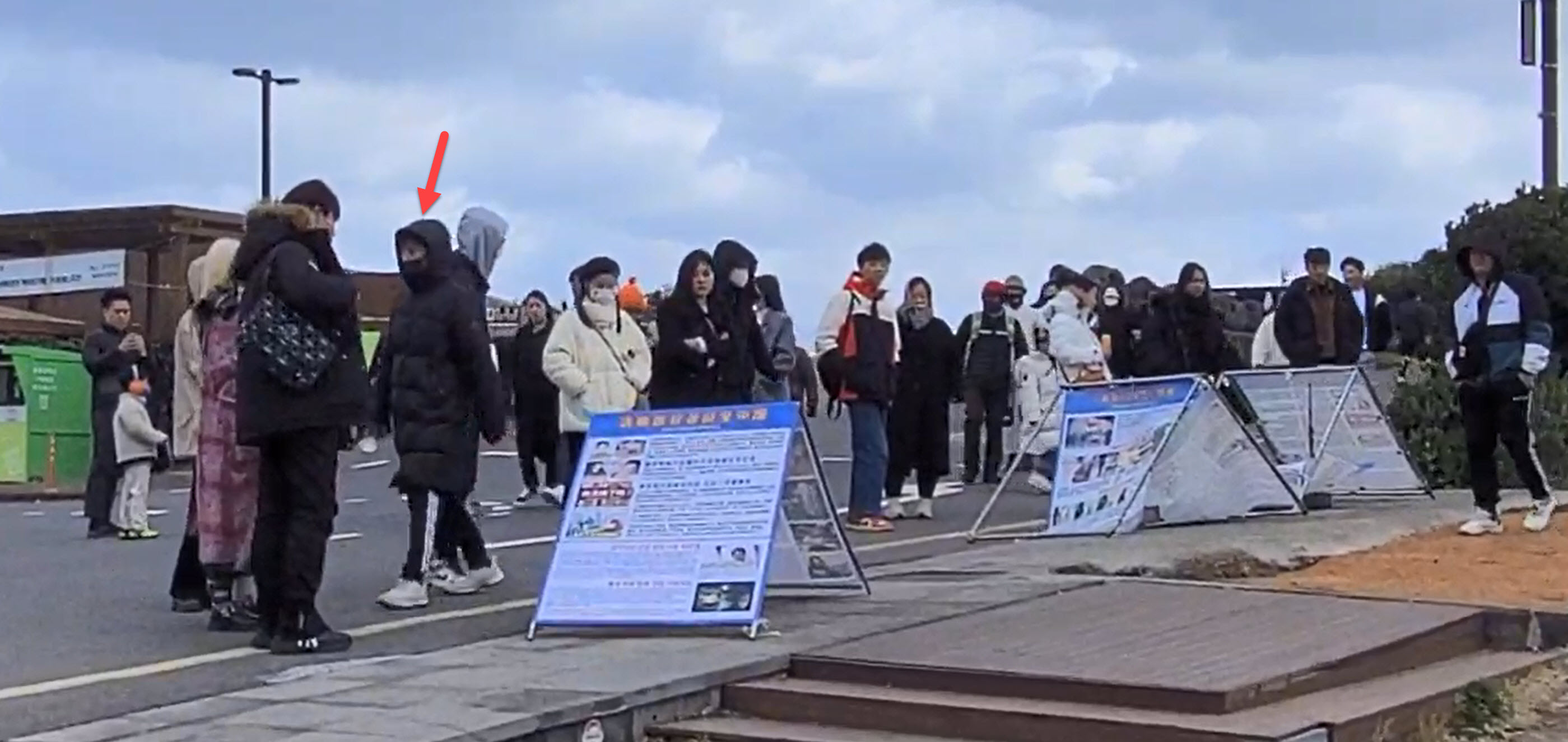 (Minghui.org) A Chinese national recently damaged Falun Gong practitioners’ poster boards at Seongsan Ilchulbong near Jeju Island, South Korea, on November 18, 2023. This is the seventh such incident within the past two months. The perpetrator, wearing glasses and a mask, was videotaped in the act of vandalism.
