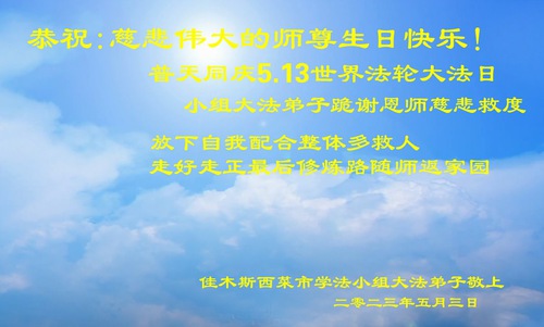 Falun Dafa Practitioners from Jiamusi City Celebrate World Falun Dafa Day and Respectfully Wish Master Li Hongzhi a Happy Birthday (20 Greetings)
