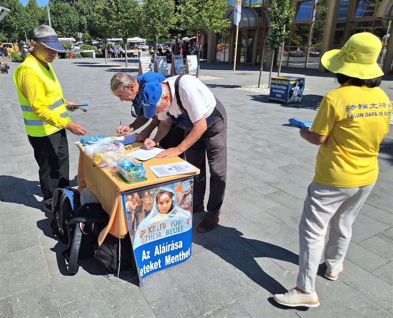 A couple who were both doctors in Balatonfüred went to the booth after receiving a flyer about the persecution. The man was shocked to learn how the CCP removes organs from living practitioners and sells them. “As a doctor, I of course deeply condemn the practice of forced organ harvesting. This is totally unacceptable and I will definitely sign your petition,” he said.