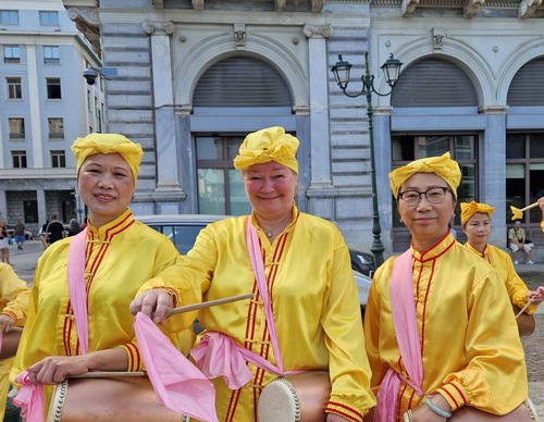 The parade was led by the European Tian Guo Marching Band, which consisted of Falun Dafa practitioners from several European countries. The band was followed by dragon dancers, then practitioners with banners that introduced the practice and the efforts to stand up against the CCP’s persecution, and ended with the waist drum team.