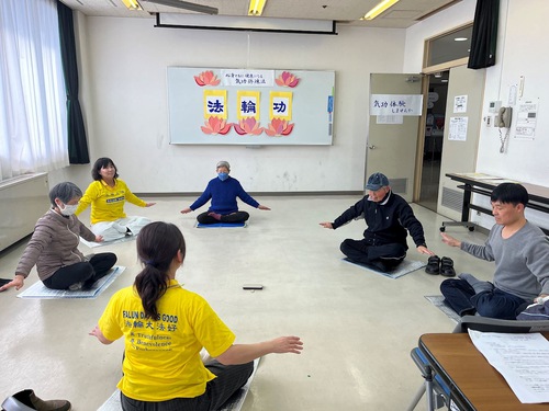 Ms. Chiyufu Yoshiko, 82, was able to sit in the lotus position on her first attempt. She said after doing the exercises, “I feel very warm and comfortable and very happy.” She asked when the free classes to learn the exercises would be held at the community center and was serious about practicing Falun Dafa.