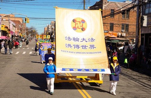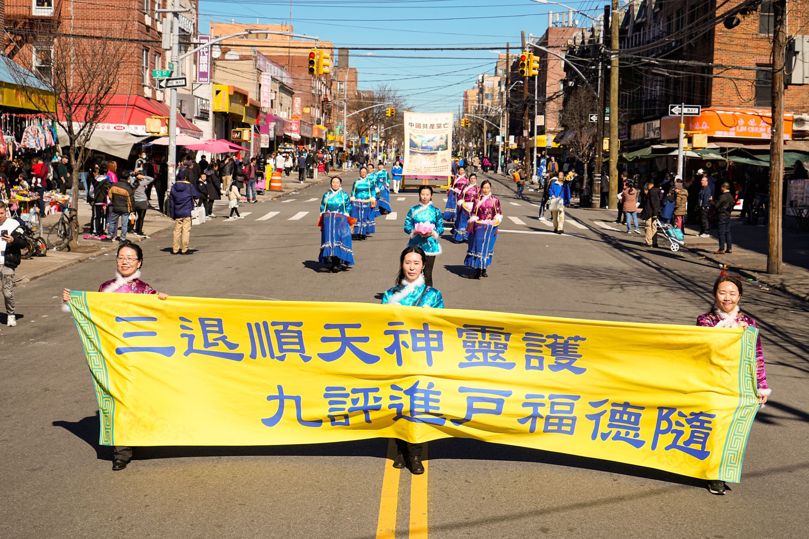 (Minghui.org) Nearly 1,000 Falun Dafa practitioners held a grand march in Brooklyn on March 3, 2024, to celebrate the millions of people who have renounced the Chinese Communist Party (CCP) and its youth organizations. Brooklyn has the third largest Chinese community in New York, and many people who saw the parade said they were glad to hear about Falun Dafa and wanted the ongoing suppression in China to end.