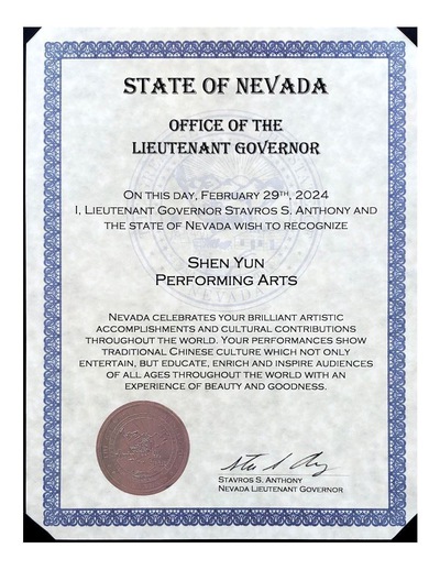 Lieutenant Governor Stavros Anthony of Nevada saw Shen Yun in Las Vegas on February 29. During his visit, he also presented a Certificate of Recognition to welcome and commend the performers for their “artistic accomplishments and cultural contributions throughout the world.”