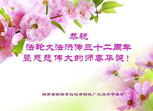 Among nine greetings hailing from Shengli Oil Field in Dongying City, Shandong Province, one practitioner wrote, “After I took up Falun Dafa in May 1994, all of my illnesses that had plagued me for years disappeared shortly afterward. My husband witnessed my dramatic change and also joined the practice. Master also protected my son when he had a severe accident while riding his motorcycle. We are the happiest family in the world.”